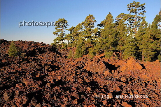Piniové borovice rostoucí na hroudách ztuhlé lávy na kraji Parque Nacional del Teide. Tenerife