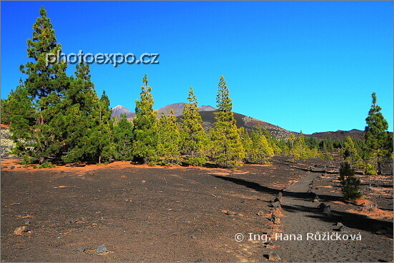 Piniové borovice v oblasti Montaňa Samára a vzadu mezi nimi vrchol Pico del Teide. Lávová krajina Národního parku Teide. Tenerife