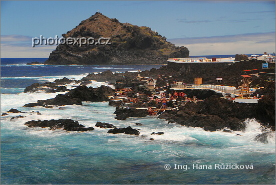 Lávové bazénky na okraji města Garachico, ráj koupání chtivých turistů i místních. V pozadí ostrov Roque de Garacho. Tenerife
