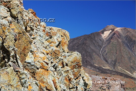 Modrá skála - Los Azulejos - na pozadí nejvyšší hory/sopky Španělska Pico del Teide ( (3 718 m n.m.). Parque Nacional del Teide. Tenerife