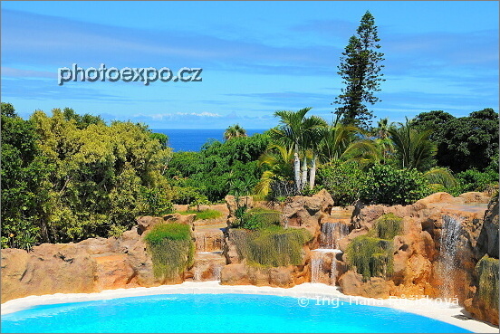 Imitace přímořského ráje v Loro Parque v místě delfíního show. Tenerife