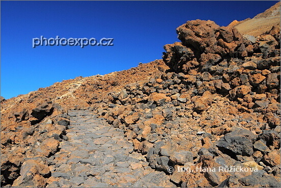 Cesta č. 12, vedoucí vlevo pod vrcholem Pico del Teide směr Pico Viejo. Parque Nacional del Teide. Tenerife