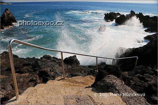 Vody Atlantiku bouřlivě se rozbíjející o lávové skály při pobřeží letoviska Puerto de Santiago. Tenerife
