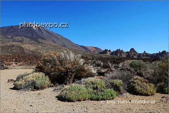 Vlevo sopka Pico del Teide, vpravo skupinka lávových skal Roques García. Parque Nacional del Teide. Tenerife