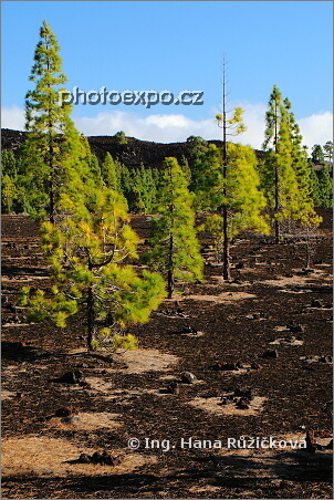 Borovice zeleně zářící na temném lávovém podkladu. Parque Nacional del Teide. Tenerife