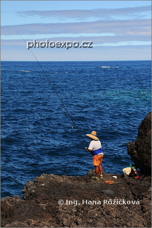 Rybář na lávových březích městečka Garachico. Tenerife