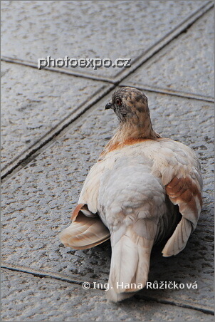 Holub snažící se chladit o dlažbu ve stínu. Playa la Arena. Tenerife